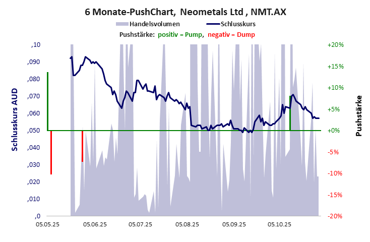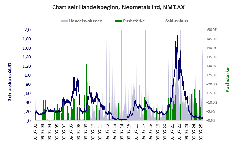 ein Miniunternehmen ohne Substanz, aber laufendem Pushverdacht. Neometals Ltd hat ein akzeptables Gesamtscoring und ist ein mickriger Pennystock mit einem riesigen Kursverlust. Das Gesamtvermögen ist beträchtlich, die Vermögenswerte scheinen nicht werthaltig zu sein, der Umsatz ist nicht existent, die Ertragslage extrem verlustreich, die Geldverbrennung extrem hoch.