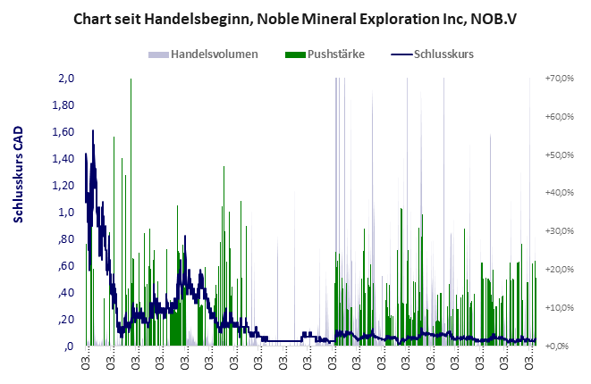 Noble Mineral hat ein schlechtes Gesamtscoring und ist ein mickriger Pennystock mit praktisch einem Totalverlust. Das Gesamtvermögen ist überschaubar, harte Vermögenswerte scheinen sehr werthaltig zu sein, der Umsatz ist nicht existent, die Ertragslage extrem verlustreich, das Defizit sehr hoch.