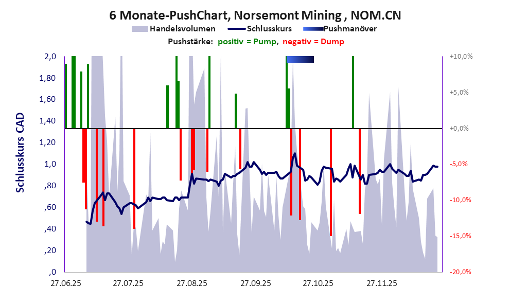 Vorrangiges Ziel scheint der Aktienhandel und nicht die Exploration zu sein. Sehr hohe Pushstärke. Bei dieser Aktie vollzogen die Akteure mindestens einen Pump & Dump und leerten damit ganz gezielt die Taschen der Anleger. Obwohl das Vorgehen rechtswidrig ist, erfolgt kaum je eine Strafverfolgung.