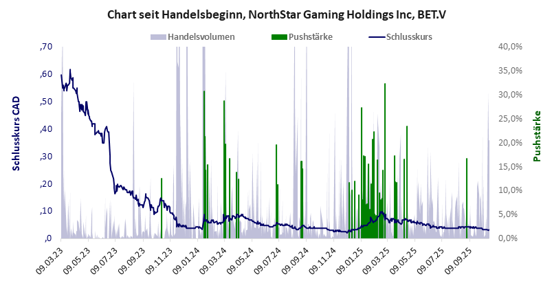 NorthStar Gaming hat ein schlechtes Gesamtscoring und ist ein mickriger Pennystock mit praktisch einem Totalverlust. Das Gesamtvermögen ist überschaubar, harte Vermögenswerte scheinen nicht vorhanden zu sein, der Umsatz ist beträchtlich, die Ertragslage sehr verlustreich, das Defizit extrem hoch.
