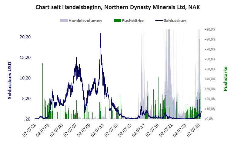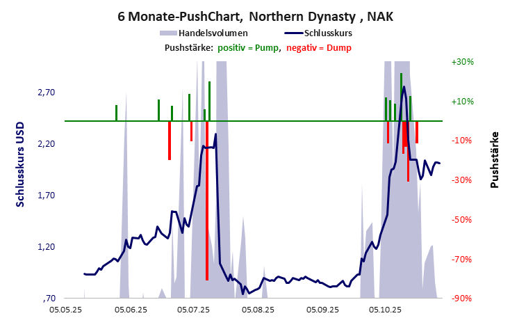Northern Dynasty hat ein mäßiges Gesamtscoring und ist eine billige Aktie mit Kursgewinn. Das Gesamtvermögen ist groß, die Vermögenswerte scheinen nicht werthaltig zu sein, der Umsatz ist nicht existent, die Ertragslage extrem verlustreich, die Geldverbrennung extrem hoch.