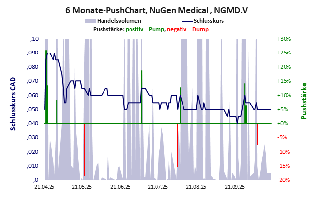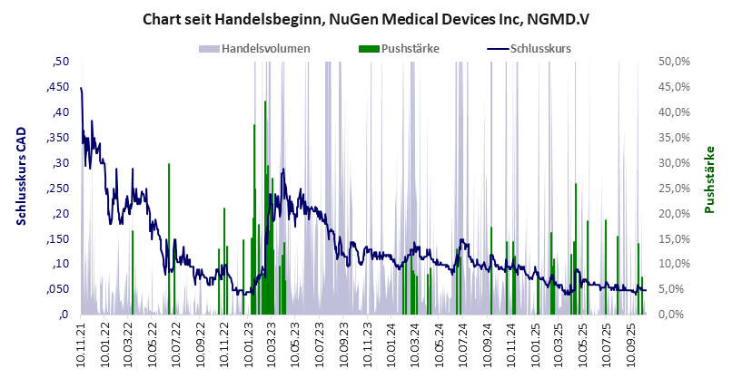 2018 startete die BuzBuz Capital Corp als Capital Pool Company und blieb ohne Geschäft bis Ende 2020. Das Geschäftsmotto war offenkundig„mal Augen offen halten, wo was geht“. Ende 2020 kaufte man die Anteile der Inolife R&D Inc und firmierte um zur NuGen Medical Devices Inc. Dass deren Geschäft nicht blüht, zeigt ein kurzer Blick in die Bilanz und wenn man sich das Netzwerk anschaut entdeckt man Bekannte wie etwa Drone Delivery oder Syntheia. Die Aktie lebt nur vom Kurspushing wie dem letzten im April 2025 von bullvestor angetriebenen. Anleger, Hände weg! NuGen Medical hat ein schlechtes Gesamtscoring und ist ein mickriger Pennystock mit einem riesigen Kursverlust. Das Gesamtvermögen ist überschaubar, harte Vermögenswerte scheinen nicht vorhanden zu sein, der Umsatz ist überschaubar, die Ertragslage extrem verlustreich, das Defizit extrem hoch.