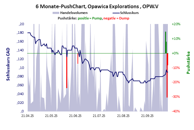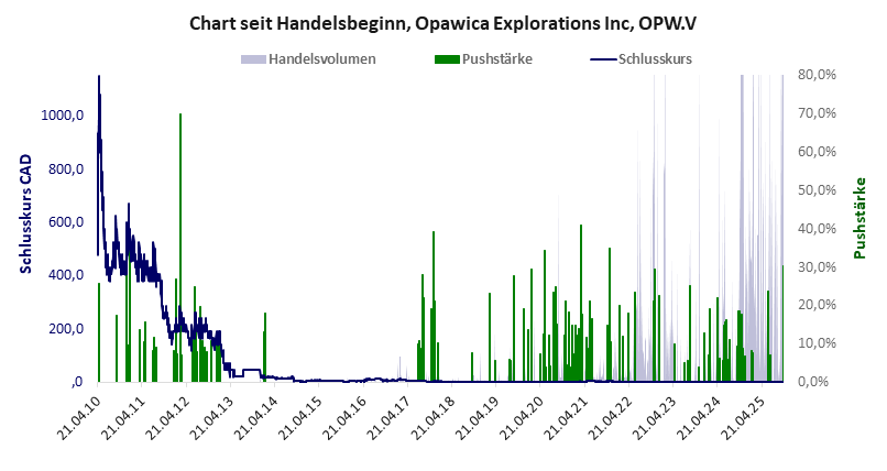 Trotz starker Pushmanöver brach der Aktienkurs im Laufe der ersten drei Jahre zusammen. Weitere Pushmanöver folgten trotz flachen Kurses bis zum letzten im Okt./Nov. 2024. Von einer völlig wertlosen Firma wird dem Publikum ein furioser Erfolg vorgegaukelt. Opawica Explorations hat ein sehr schlechtes Gesamtscoring und ist ein mickriger Pennystock mit praktisch einem Totalverlust. Das Gesamtvermögen ist überschaubar, harte Vermögenswerte scheinen sehr werthaltig zu sein, der Umsatz ist nicht existent, die Ertragslage extrem verlustreich, das Defizit extrem hoch.
