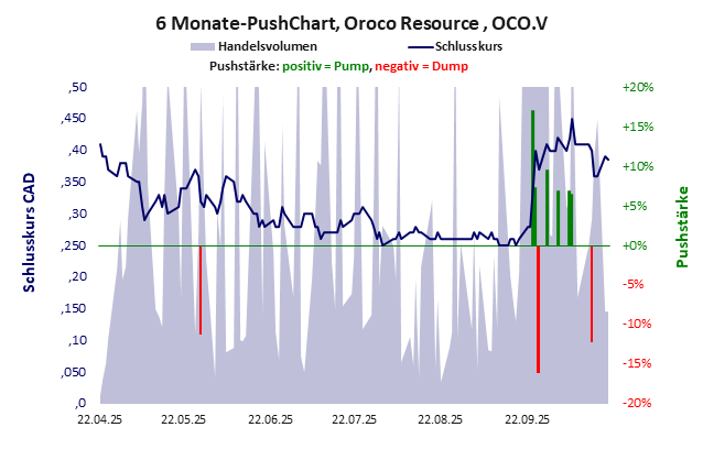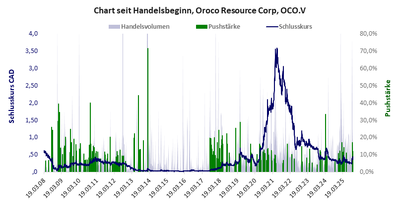 Oroco Resource hat ein kritisches Gesamtscoring und ist ein kleiner Pennystock mit einem starken Kursverlust. Das Gesamtvermögen ist beträchtlich, harte Vermögenswerte scheinen nicht werthaltig zu sein, der Umsatz ist nicht existent, die Ertragslage extrem verlustreich, das Defizit erträglich.