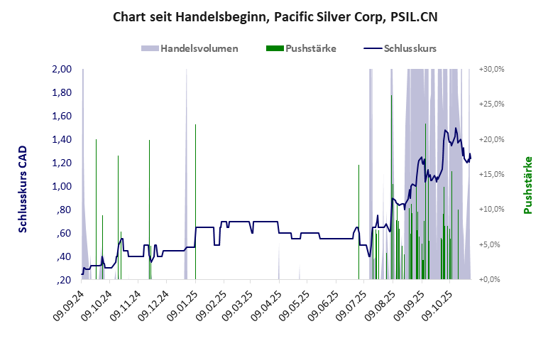 Pacific Silver hat ein schlechtes Gesamtscoring und ist eine billige Aktie mit Kursgewinn. Das Gesamtvermögen ist karg, die Vermögenswerte scheinen wenig werthaltig zu sein, der Umsatz ist nicht existent, die Ertragslage extrem verlustreich, die Geldverbrennung sehr hoch.