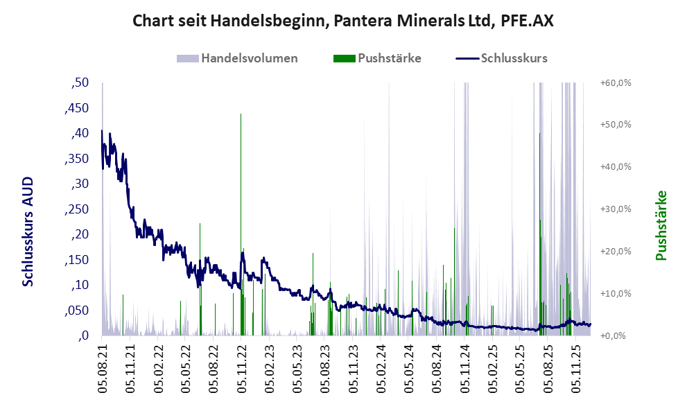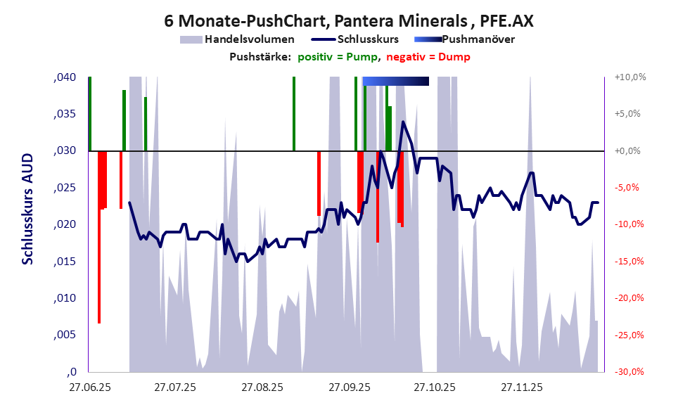 Bei dieser Aktie liegt das „Inkassomodell“ vor, bei dem der Aktienkurs zu Beginn der Geschichte sein Allzeithoch hat. Die Akteure verkaufen schon zu Beginn nach und nach ihre billigst erworbenen Aktien, so dass der Kurs in verhältnismäßig kurzer Zeit abstürzt. Danach dümpelt der Aktienkurs in den meistn Fällen nahe null dahin und die Aktie dient nur noch kleineren, dennoch gewinnbringenden Pushmanövern und in vielen Fällen dem Algotrading. Dem ersten Einbruch nachfolgende größere Pushmanöver sind aber nicht ausgeschlossen.