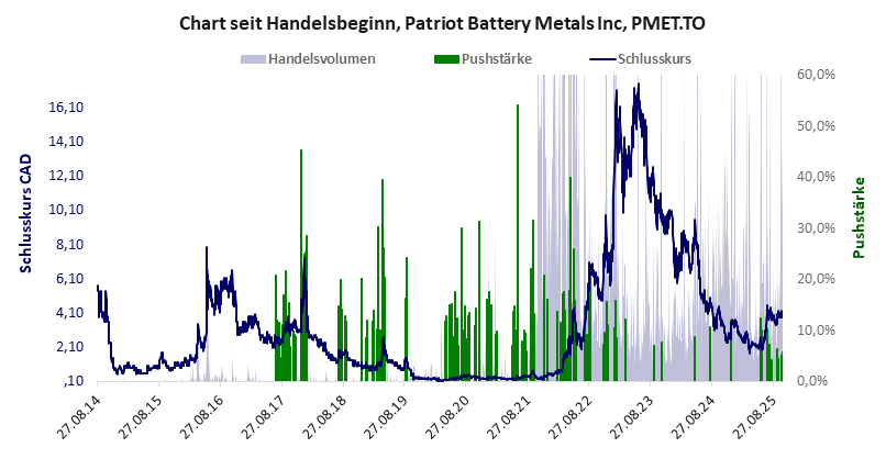 der Wandel von einer Pusheraktie zu einem in 2029 produzierenden Bergbauunternehmen steht an. Die Aussichten sind gut, aber es dauert noch lange. Patriot Battery hat ein schwaches Gesamtscoring und ist eine billige Aktie mit einem starken Kursverlust. Das Gesamtvermögen ist groß, harte Vermögenswerte scheinen sehr werthaltig zu sein, der Umsatz ist nicht existent, die Ertragslage extrem verlustreich, das Defizit gering.