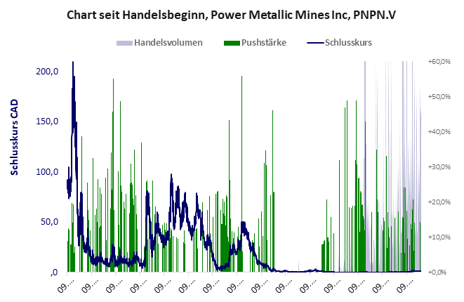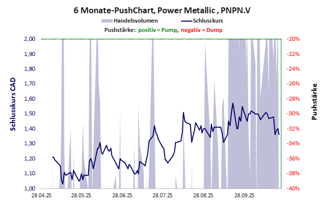 Power Metallic hat ein sehr schlechtes Gesamtscoring und ist ein mickriger Pennystock mit praktisch einem Totalverlust. Das Gesamtvermögen ist überschaubar, harte Vermögenswerte scheinen nicht vorhanden zu sein, der Umsatz ist nicht existent, die Ertragslage extrem verlustreich, das Defizit extrem hoch.