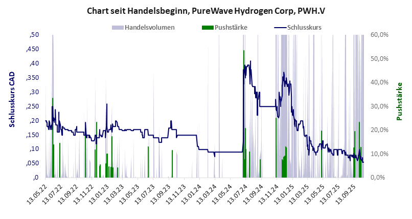 eine neuere Pusheraktie ohne Substanz zur Ausbeutung des Hypes um weißen Wasserstoff PureWave Hydrogen hat ein schlechtes Gesamtscoring und ist ein mickriger Pennystock mit einem riesigen Kursverlust. Das Gesamtvermögen ist karg, harte Vermögenswerte scheinen sehr werthaltig zu sein, der Umsatz ist nicht existent, die Ertragslage extrem verlustreich, das Defizit gering.