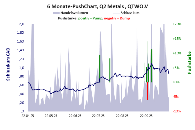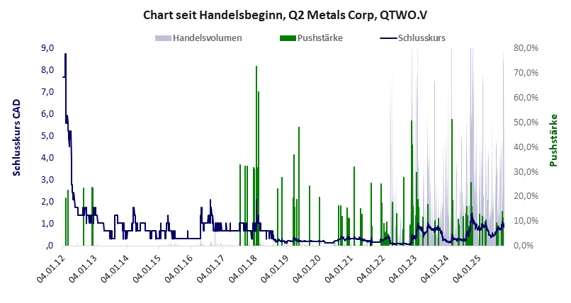Q2 Metals hat ein kritisches Gesamtscoring und ist ein Pennystock mit einem riesigen Kursverlust. Das Gesamtvermögen ist beträchtlich, harte Vermögenswerte scheinen sehr werthaltig zu sein, der Umsatz ist nicht existent, die Ertragslage extrem verlustreich, das Defizit erträglich.