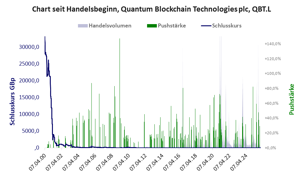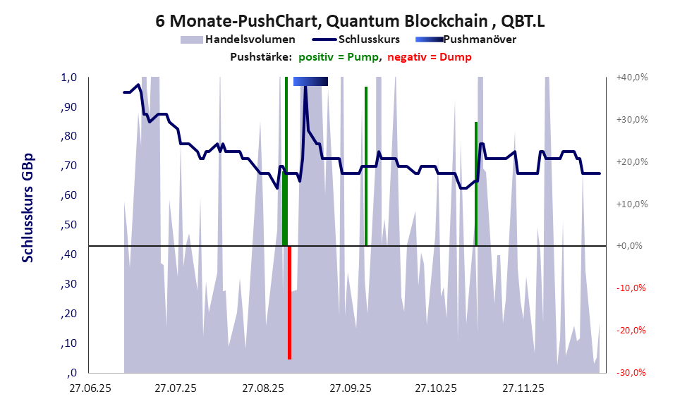 ein wertloses Unternehmen, dessen Kurs nach anfänglichen Spekulationen darniederliegt, auch wenn aktuell (Jan. 2025) wieder ein Push läuft. Bei dieser Aktie liegt das „Inkassomodell“ vor, bei dem der Aktienkurs zu Beginn der Geschichte sein Allzeithoch hat. Die Akteure verkaufen schon zu Beginn nach und nach ihre billigst erworbenen Aktien, so dass der Kurs in verhältnismäßig kurzer Zeit abstürzt. Danach dümpelt der Aktienkurs in den meistn Fällen nahe null dahin und die Aktie dient nur noch kleineren, dennoch gewinnbringenden Pushmanövern und in vielen Fällen dem Algotrading. Dem ersten Einbruch nachfolgende größere Pushmanöver sind aber nicht ausgeschlossen. Bei dieser Aktie vollzogen die Akteure mindestens einen Pump & Dump und leerten damit ganz gezielt die Taschen der Anleger. Obwohl das Vorgehen rechtswidrig ist, erfolgt kaum je eine Strafverfolgung.