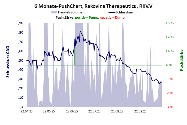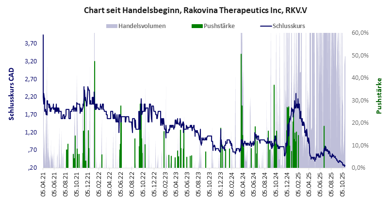 ein Schein von Pharmaunternehmen, keine Substanz, kein Kurs, aber Kurspushing. Knüpft nahtlos an die Rakovina Therapeutics hat ein schlechtes Gesamtscoring und ist ein kleiner Pennystock mit einem riesigen Kursverlust. Das Gesamtvermögen ist überschaubar, harte Vermögenswerte scheinen nicht vorhanden zu sein, der Umsatz ist nicht existent, die Ertragslage extrem verlustreich, das Defizit sehr hoch.