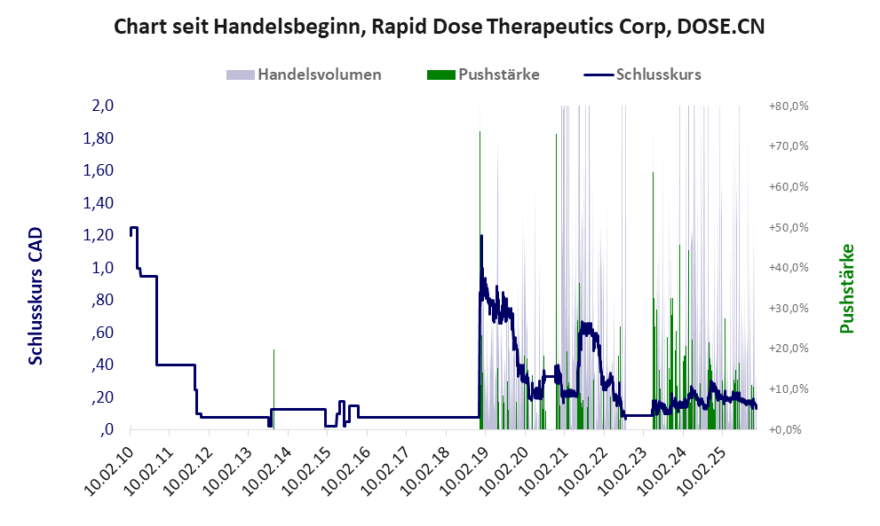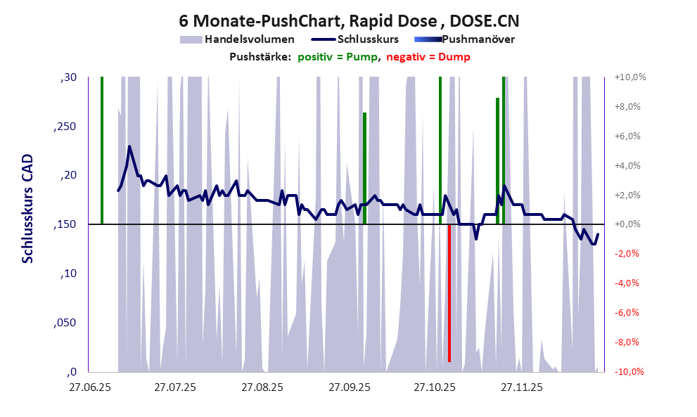 Eine Firma mit nichts als einem gepushten Kurs. Bei dieser Aktie liegt das „Inkassomodell“ vor, bei dem der Aktienkurs zu Beginn der Geschichte sein Allzeithoch hat. Die Akteure verkaufen schon zu Beginn nach und nach ihre billigst erworbenen Aktien, so dass der Kurs in verhältnismäßig kurzer Zeit abstürzt. Danach dümpelt der Aktienkurs in den meistn Fällen nahe null dahin und die Aktie dient nur noch kleineren, dennoch gewinnbringenden Pushmanövern und in vielen Fällen dem Algotrading. Dem ersten Einbruch nachfolgende größere Pushmanöver sind aber nicht ausgeschlossen.