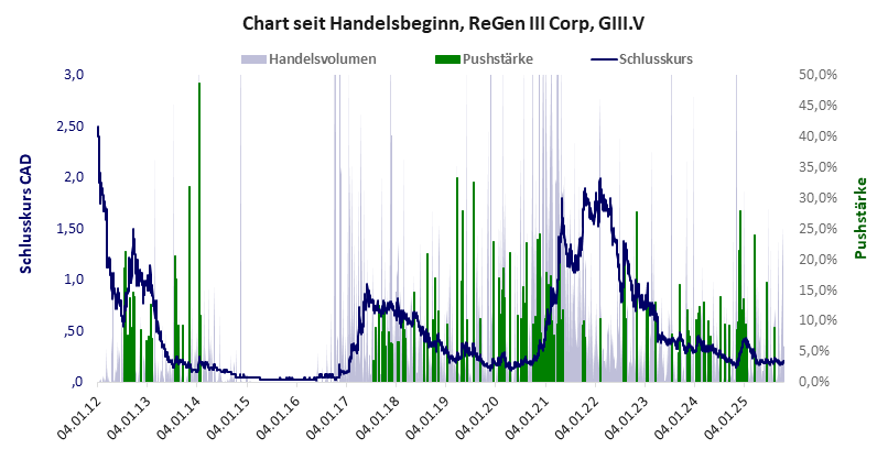 typische Pusheraktie, substanzlos und Netzwerk. ReGen III hat ein sehr schlechtes Gesamtscoring und ist ein kleiner Pennystock mit einem riesigen Kursverlust. Das Gesamtvermögen ist karg, harte Vermögenswerte scheinen nicht werthaltig zu sein, der Umsatz ist nicht existent, die Ertragslage extrem verlustreich, das Defizit extrem hoch.