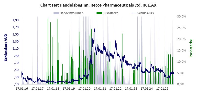 ein typischer Pharmapush eines völlig wertlosen Unternehmens. Recce Pharmaceuticals hat ein kritisches Gesamtscoring und ist ein kleiner Pennystock mit Kursgewinn. Das Gesamtvermögen ist überschaubar, harte Vermögenswerte scheinen nicht werthaltig zu sein, der Umsatz ist nicht existent, die Ertragslage extrem verlustreich, das Defizit extrem hoch.