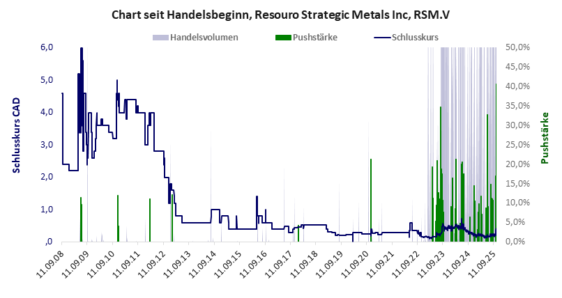 Schön zu sehen, dass erst ab Sommer 2023 gepusht wird, aber ohne Erfolg. Die Anleger haben die Wertlosigkeit von Resouro erkannt. Resouro Strategic hat ein kritisches Gesamtscoring und ist ein kleiner Pennystock mit einem riesigen Kursverlust. Das Gesamtvermögen ist überschaubar, harte Vermögenswerte scheinen sehr werthaltig zu sein, der Umsatz ist nicht existent, die Ertragslage extrem verlustreich, das Defizit hoch.