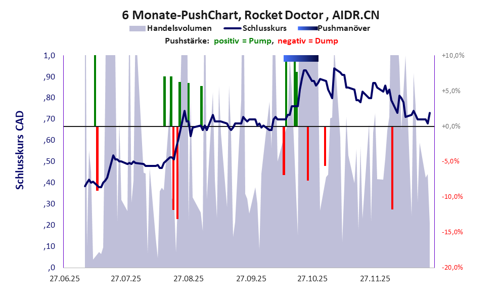 Bei dieser Aktie liegt das „Inkassomodell“ vor, bei dem der Aktienkurs zu Beginn der Geschichte sein Allzeithoch hat. Die Akteure verkaufen schon zu Beginn nach und nach ihre billigst erworbenen Aktien, so dass der Kurs in verhältnismäßig kurzer Zeit abstürzt. Danach dümpelt der Aktienkurs in den meistn Fällen nahe null dahin und die Aktie dient nur noch kleineren, dennoch gewinnbringenden Pushmanövern und in vielen Fällen dem Algotrading. Dem ersten Einbruch nachfolgende größere Pushmanöver sind aber nicht ausgeschlossen. Bei dieser Aktie vollzogen die Akteure mindestens einen Pump & Dump und leerten damit ganz gezielt die Taschen der Anleger. Obwohl das Vorgehen rechtswidrig ist, erfolgt kaum je eine Strafverfolgung.