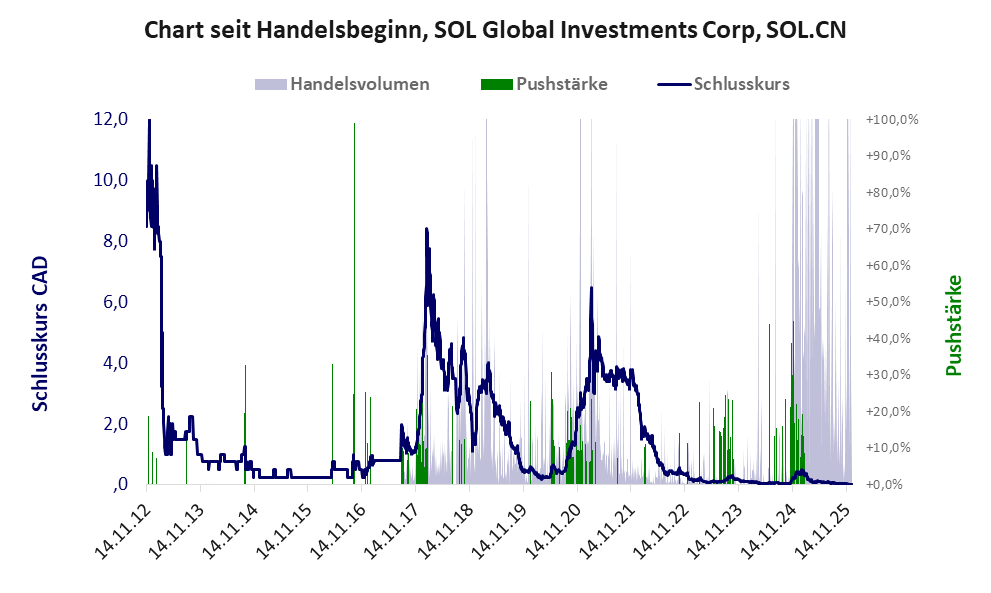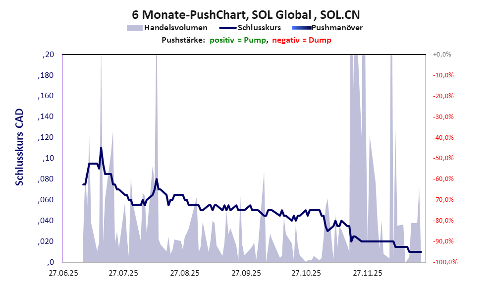 Dieser Aktie liegt das „Refreshmodell“ zu Grunde. Eine Durchsicht aller Geschäftsberichte würde recht sicher zeigen, dass das Unternehmen nie Umsatz und Profit erzielte und die gesamten Explorationskosten unter „Aktiva“ verbuchte. Das heißt, während aller Jahre wurde nichts gefunden, sondern die Investorengelder wurden für erfolglose Explorationsarbeiten verbrannt. Die bescheidene Exploration dient lediglich als Grundlage zur medialen Vermarktung von Erfolgsaussichten, auf eine große Lagerstätte zu stoßen, um damit das nächste Pushmanöver zu befeuern. Bei dieser Aktie liegt das „Inkassomodell“ vor, bei dem der Aktienkurs zu Beginn der Geschichte sein Allzeithoch hat. Die Akteure verkaufen schon zu Beginn nach und nach ihre billigst erworbenen Aktien, so dass der Kurs in verhältnismäßig kurzer Zeit abstürzt. Danach dümpelt der Aktienkurs in den meistn Fällen nahe null dahin und die Aktie dient nur noch kleineren, dennoch gewinnbringenden Pushmanövern und in vielen Fällen dem Algotrading. Dem ersten Einbruch nachfolgende größere Pushmanöver sind aber nicht ausgeschlossen. Bei dieser Aktie vollzogen die Akteure mindestens einen Pump & Dump und leerten damit ganz gezielt die Taschen der Anleger. Obwohl das Vorgehen rechtswidrig ist, erfolgt kaum je eine Strafverfolgung.