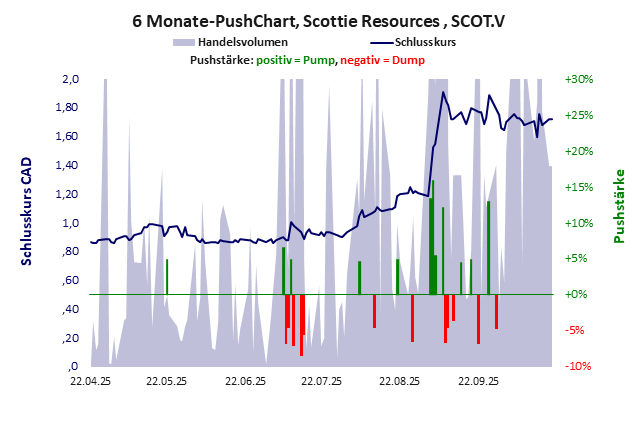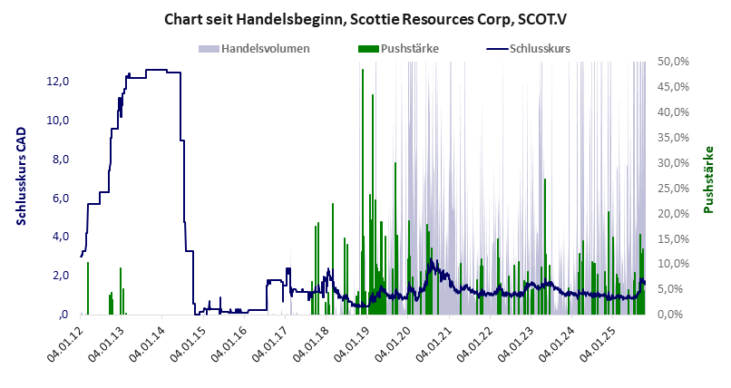 Geldverbrennungsmaschine, sonst nichts. Scottie Resources hat ein schwaches Gesamtscoring und ist eine billige Aktie mit einem starken Kursverlust. Das Gesamtvermögen ist überschaubar, harte Vermögenswerte scheinen nicht werthaltig zu sein, der Umsatz ist nicht existent, die Ertragslage extrem verlustreich, das Defizit extrem hoch.