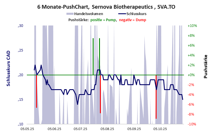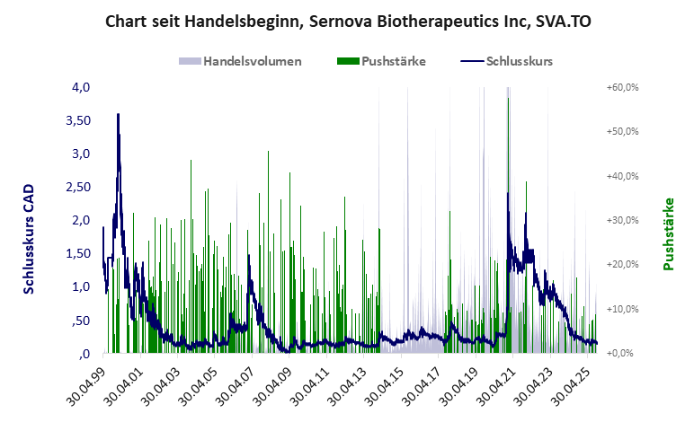 Seit einem Viertel Jahrhundert verbrennt Sernova das Geld der Anleger. Der kleine Mittelständler hat vornehmlich Verluste generiert und außer kurstreibender Hoffnung nichts Substanzielles zu bieten. Der Kurs nähert sich nach dem dritten Push wieder dem Boden. Sernova Biotherapeutics hat ein unbefriedigendes Gesamtscoring und ist ein mickriger Pennystock mit einem riesigen Kursverlust. Das Gesamtvermögen ist überschaubar, die Vermögenswerte scheinen wenig werthaltig zu sein, der Umsatz ist nicht existent, die Ertragslage extrem verlustreich, die Geldverbrennung extrem hoch.