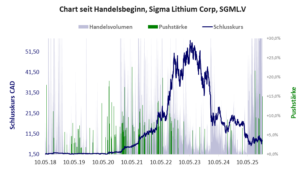 Die Pushstärke ist ein Maß, wie stark der Handelskurs der jüngsten Zeit vom Durchschnitt der Vergangenheit abweicht, und belegt somit Pushaktivitäten