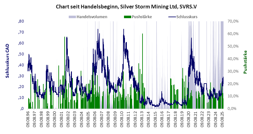 Die Aktie ist eigentlich Schrott wert, aber mit den wiederkehrenden Pushes wohl attraktiv für Zocker. Silver Storm hat ein schlechtes Gesamtscoring und ist ein kleiner Pennystock mit einem starken Kursverlust. Das Gesamtvermögen ist überschaubar, harte Vermögenswerte scheinen sehr werthaltig zu sein, der Umsatz ist nicht existent, die Ertragslage extrem verlustreich, das Defizit hoch.