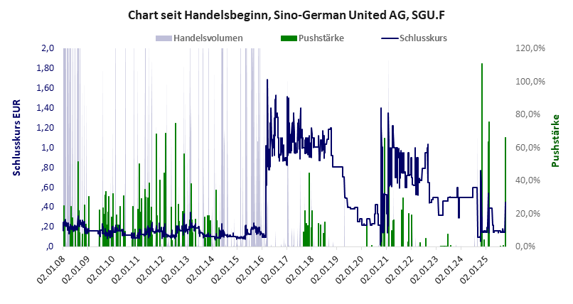 Sino-German United hat ein schlechtes Gesamtscoring und ist ein kleiner Pennystock mit Kursgewinn. Das Gesamtvermögen ist karg, harte Vermögenswerte scheinen nicht vorhanden zu sein, der Umsatz ist überschaubar, die Ertragslage mäßig, das Defizit ziemlich hoch.