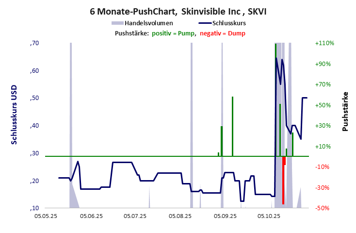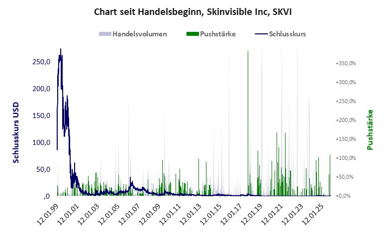 eine völlig wertlose Firmenhülle, deren Kurs immer wieder und selbst in jüngster Zeit gepusht wurde. Reine Gaukelei. Skinvisible Inc hat ein inakzeptables Gesamtscoring und ist ein Pennystock mit praktisch einem Totalverlust. Das Gesamtvermögen ist karg, die Vermögenswerte scheinen nicht vorhanden zu sein, der Umsatz ist mickrig, die Ertragslage extrem verlustreich, die Geldverbrennung extrem hoch.