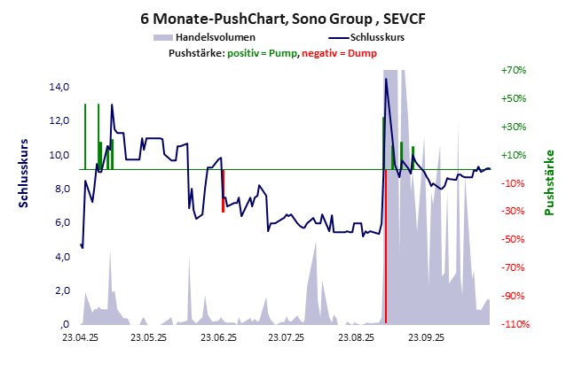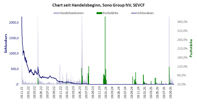 ein problematischer Habenichts mit massiv gepushtem Kurs ohne jeden Erfolg. Kursanstieg im Jan. 25 wegen einer 1:75 Aktienzusammenlegung. Sono Group hat ein grottenschlechtes Gesamtscoring und ist eine günstige Aktie mit praktisch einem Totalverlust. Das Gesamtvermögen ist karg, harte Vermögenswerte scheinen noch werthaltig zu sein, der Umsatz ist mickrig, die Ertragslage extrem verlustreich, das Defizit extrem hoch.