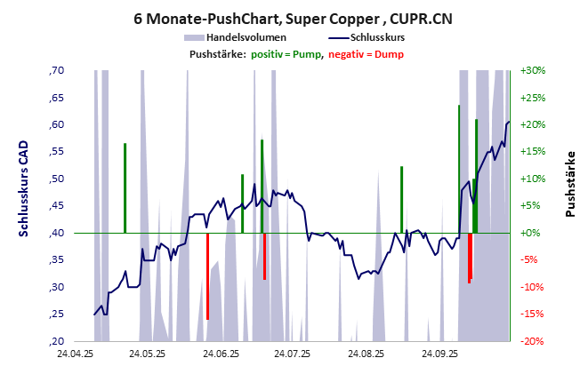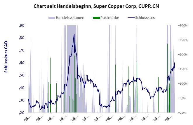 Super Copper hat ein unbefriedigendes Gesamtscoring und ist ein Pennystock mit Kursgewinn. Das Gesamtvermögen ist karg, harte Vermögenswerte scheinen nicht vorhanden zu sein, der Umsatz ist nicht existent, die Ertragslage extrem verlustreich, das Defizit extrem hoch.