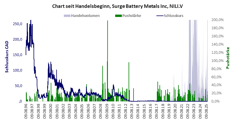 ein ziemlich wertloses Unternehmen mit gepushtem Kurs in großem Netzwerk und laufender Werbung. Surge Battery hat ein sehr schlechtes Gesamtscoring und ist ein kleiner Pennystock mit praktisch einem Totalverlust. Das Gesamtvermögen ist überschaubar, harte Vermögenswerte scheinen nicht werthaltig zu sein, der Umsatz ist nicht existent, die Ertragslage extrem verlustreich, das Defizit extrem hoch.
