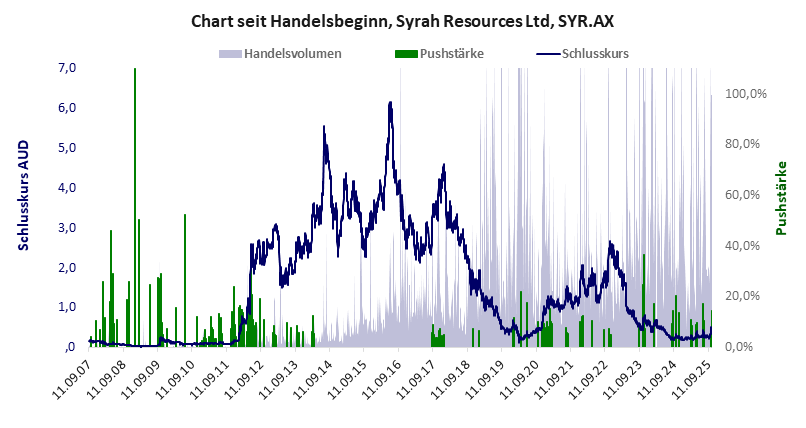 Die Vermögenswerte sind gut, die Ergebnisse tiefrot. Der Kursverlauf zeigt starke Pushindikationen, Die Aktie ist fast nichts mehr wert. Syrah Resources hat ein kritisches Gesamtscoring und ist ein mickriger Pennystock mit praktisch einem Totalverlust. Das Gesamtvermögen ist groß, harte Vermögenswerte scheinen sehr werthaltig zu sein, der Umsatz ist beträchtlich, die Ertragslage extrem verlustreich, das Defizit ziemlich hoch.
