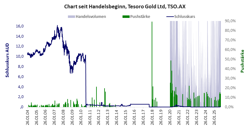 Tesoro Gold hat ein kritisches Gesamtscoring und ist ein mickriger Pennystock mit praktisch einem Totalverlust. Das Gesamtvermögen ist überschaubar, harte Vermögenswerte scheinen nicht werthaltig zu sein, der Umsatz ist nicht existent, die Ertragslage extrem verlustreich, das Defizit erträglich.
