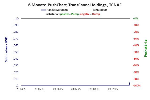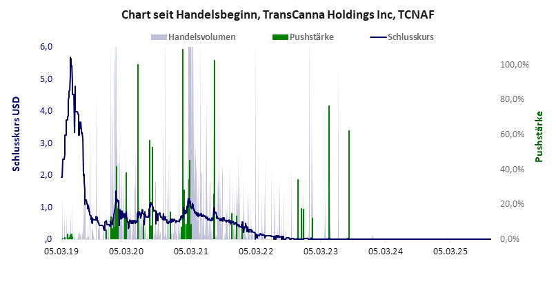 Es war 2019 das große Pushmanöver von James Pakulis. Er übernahm die Lifestyle Delivery Systems Inc und machte daraus die Transcanna Holdings und mit ihr einen Aktienpush von über 500%. Danach sorgten die Nachfolger für einige kleinere Pushes. Im Jahr 2024 war die Aktie wertlos und schied aus dem Handel. Sie ist an der kanadischen CSE "suspended". TransCanna Holdings hat ein inakzeptables Gesamtscoring und ist ein mickriger Pennystock mit praktisch einem Totalverlust. Das Gesamtvermögen ist überschaubar, harte Vermögenswerte scheinen nicht werthaltig zu sein, der Umsatz ist überschaubar, die Ertragslage extrem verlustreich, das Defizit sehr hoch.
