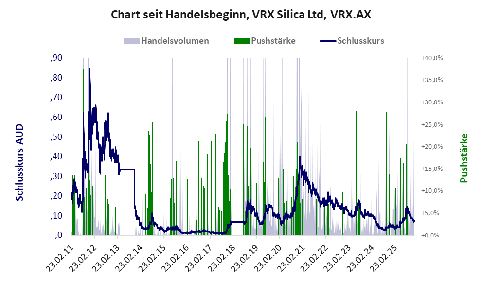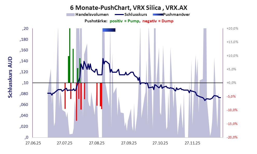 Bei dieser Aktie liegt das „Inkassomodell“ vor, bei dem der Aktienkurs zu Beginn der Geschichte sein Allzeithoch hat. Die Akteure verkaufen schon zu Beginn nach und nach ihre billigst erworbenen Aktien, so dass der Kurs in verhältnismäßig kurzer Zeit abstürzt. Danach dümpelt der Aktienkurs in den meistn Fällen nahe null dahin und die Aktie dient nur noch kleineren, dennoch gewinnbringenden Pushmanövern und in vielen Fällen dem Algotrading. Dem ersten Einbruch nachfolgende größere Pushmanöver sind aber nicht ausgeschlossen.