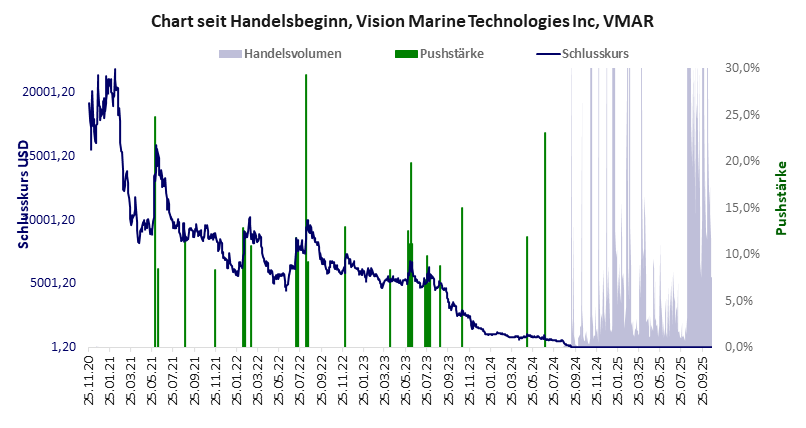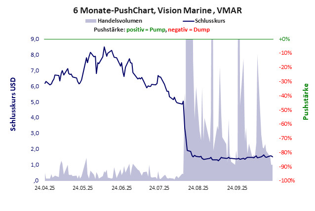 ein Habenichts, dessen Kurs im steten Sinkflug ist und der im März 2025 einen neuen Push versucht. Vision Marine hat ein sehr schlechtes Gesamtscoring und ist eine billige Aktie mit praktisch einem Totalverlust. Das Gesamtvermögen ist überschaubar, harte Vermögenswerte scheinen wenig werthaltig zu sein, der Umsatz ist überschaubar, die Ertragslage extrem verlustreich, das Defizit extrem hoch.