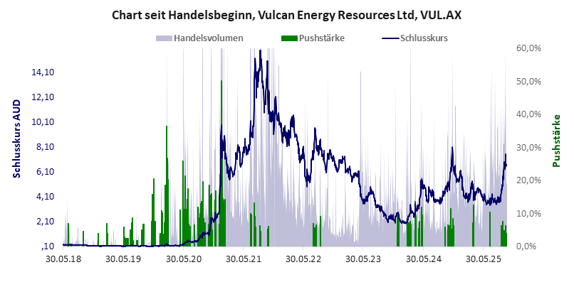 Keine Pusheraktie, aber gepushte Kurse, deren Treiber unbekannt sind. Solider Mittelständler auf der Suche nach den notwendigen Milliarden für das Lithium-Projekt im Rheintalgraben. Die Chancen scheinen gut zu stehen, Scheitern ist dennoch nicht ausgeschlossen. Vulcan Energy hat ein schwaches Gesamtscoring und ist ein mickriger Pennystock mit praktisch einem Totalverlust. Das Gesamtvermögen ist groß, harte Vermögenswerte scheinen sehr werthaltig zu sein, der Umsatz ist überschaubar, die Ertragslage extrem verlustreich, das Defizit gering.