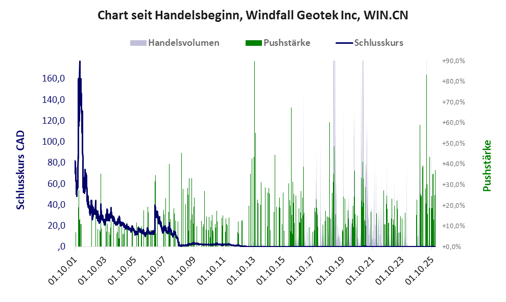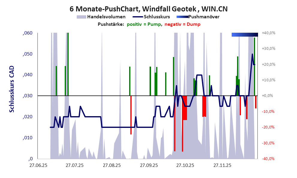 Bei dieser Aktie liegt das „Inkassomodell“ vor, bei dem der Aktienkurs zu Beginn der Geschichte sein Allzeithoch hat. Die Akteure verkaufen schon zu Beginn nach und nach ihre billigst erworbenen Aktien, so dass der Kurs in verhältnismäßig kurzer Zeit abstürzt. Danach dümpelt der Aktienkurs in den meistn Fällen nahe null dahin und die Aktie dient nur noch kleineren, dennoch gewinnbringenden Pushmanövern und in vielen Fällen dem Algotrading. Dem ersten Einbruch nachfolgende größere Pushmanöver sind aber nicht ausgeschlossen.