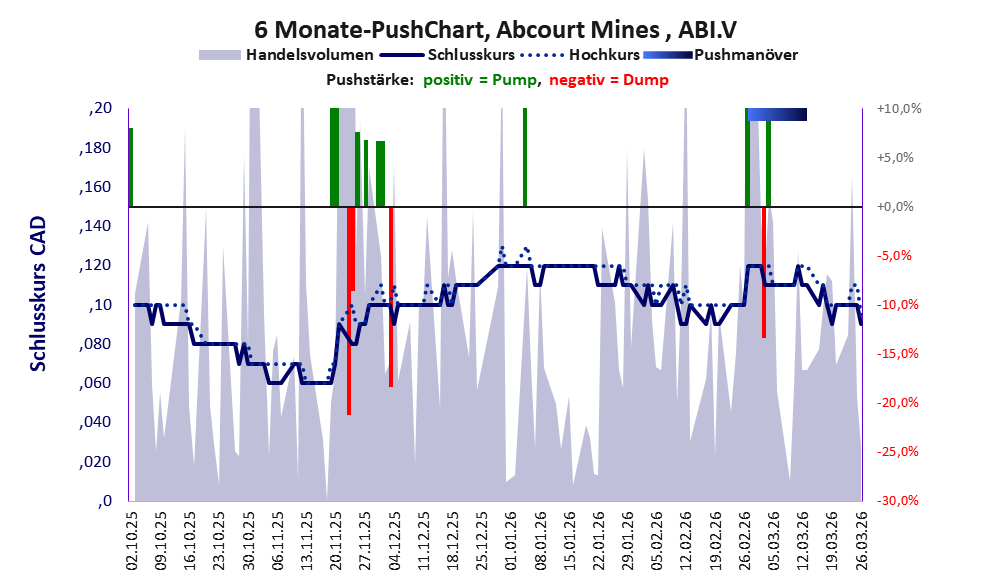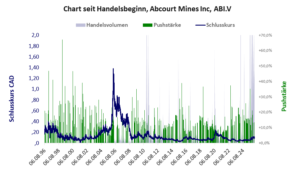 Über diese Aktie berichtet w:o. Das tägliche Handelsvolumen betrug an obiger Börse während der letzten drei Monate bis Berichtsdatum: 1.779.608 Stück, das sind 0,1% der ausgegebenen Aktien. Bei Abcourt Mines rechtfertigt das schwache operative Geschäft nicht die Geldverbrennung.