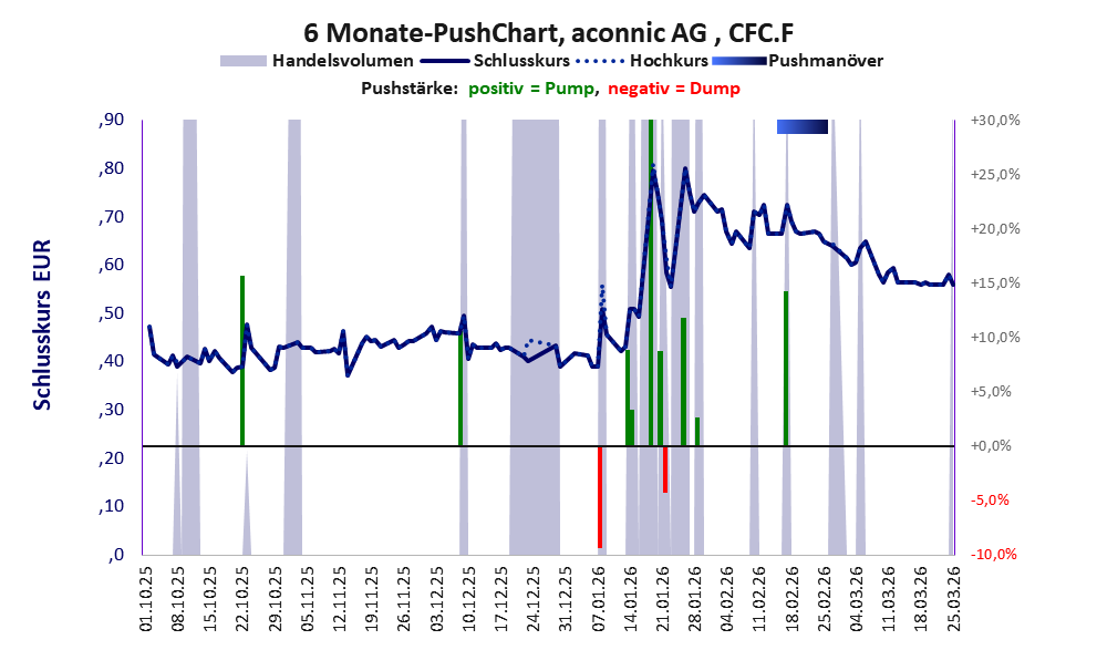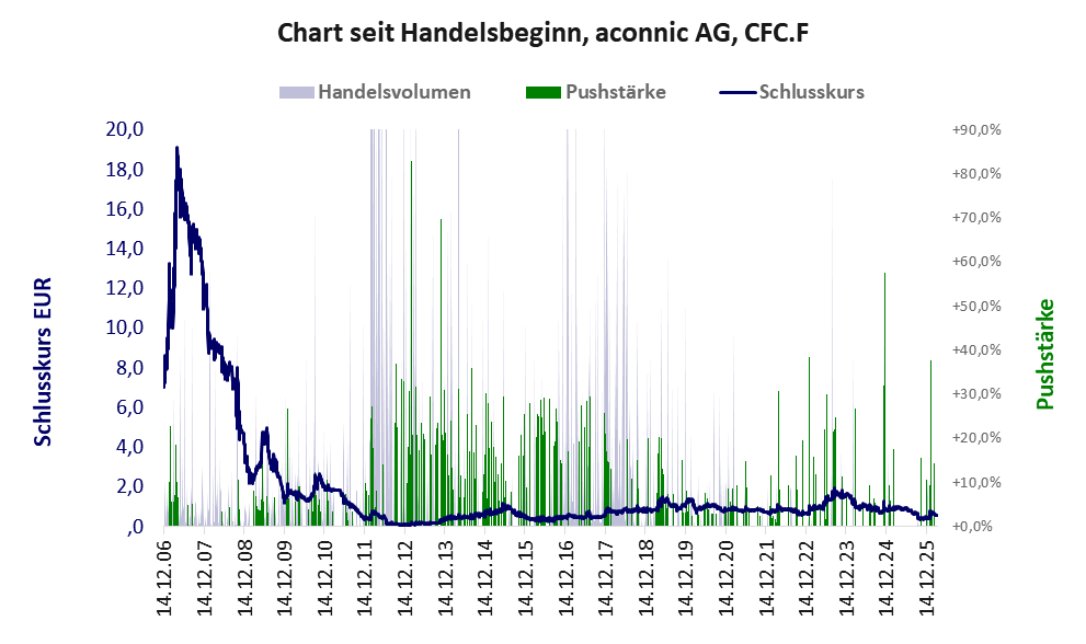 Bei dieser Aktie, über die w:o berichtet, liegt das Inkassomodell vor. Das tägliche Handelsvolumen betrug an obiger Börse während der letzten drei Monate bis Berichtsdatum: 325 Stück, das sind 0,0% der ausgegebenen Aktien. Bei aconnic AG rechtfertigt das schwache operative Geschäft nicht die Geldverbrennung.