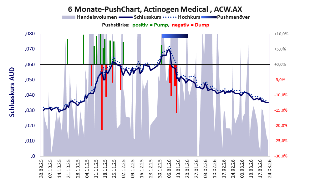 Bei dieser Aktie, über die w:o berichtet, liegt das Refreshmodell und das Inkassomodell vor und es gibt 35 Pump & Dump-Manöver. Das tägliche Handelsvolumen betrug an obiger Börse während der letzten drei Monate bis Berichtsdatum: 4.521.298 Stück, das sind 0,1% der ausgegebenen Aktien. In Aktien der Klasse V darf man grundsätzlich nicht investieren. Es gibt keinen ordentlichen Geschäftsbetrieb. Die Aktie hat nur den Zweck, mit Pushmanövern oder Algotrading an der Börse Kasse zu machen.