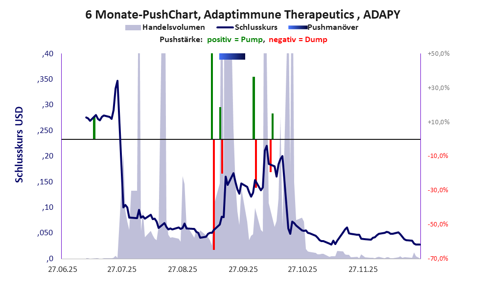 Ein Pharma-Unternehmen mit operativem Betrieb, riesigem Defizit, Kurshypes und kollabiertem Aktienkurs. Bei dieser Aktie liegt das „Inkassomodell“ vor, bei dem der Aktienkurs zu Beginn der Geschichte sein Allzeithoch hat. Die Akteure verkaufen schon zu Beginn nach und nach ihre billigst erworbenen Aktien, so dass der Kurs in verhältnismäßig kurzer Zeit abstürzt. Danach dümpelt der Aktienkurs in den meistn Fällen nahe null dahin und die Aktie dient nur noch kleineren, dennoch gewinnbringenden Pushmanövern und in vielen Fällen dem Algotrading. Dem ersten Einbruch nachfolgende größere Pushmanöver sind aber nicht ausgeschlossen.