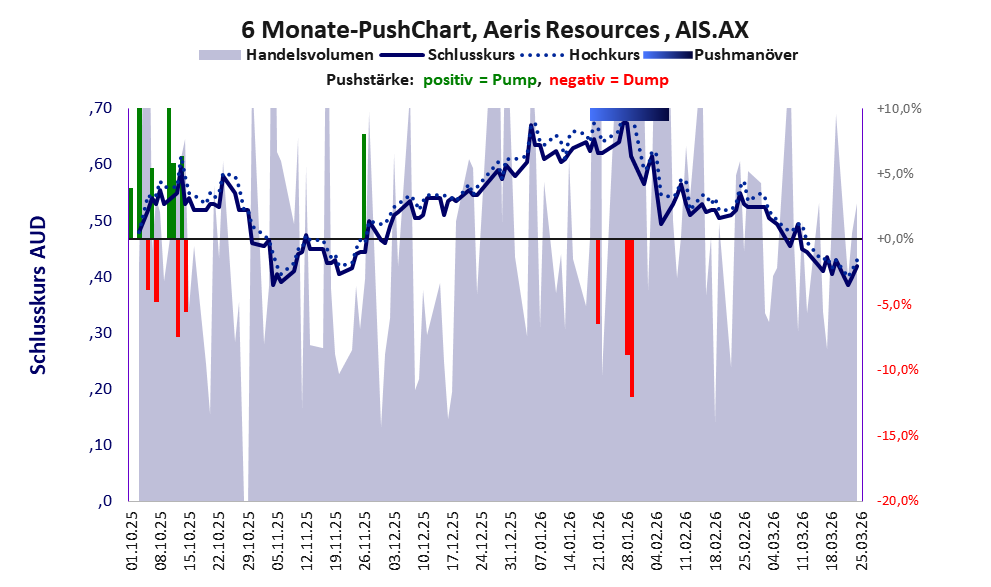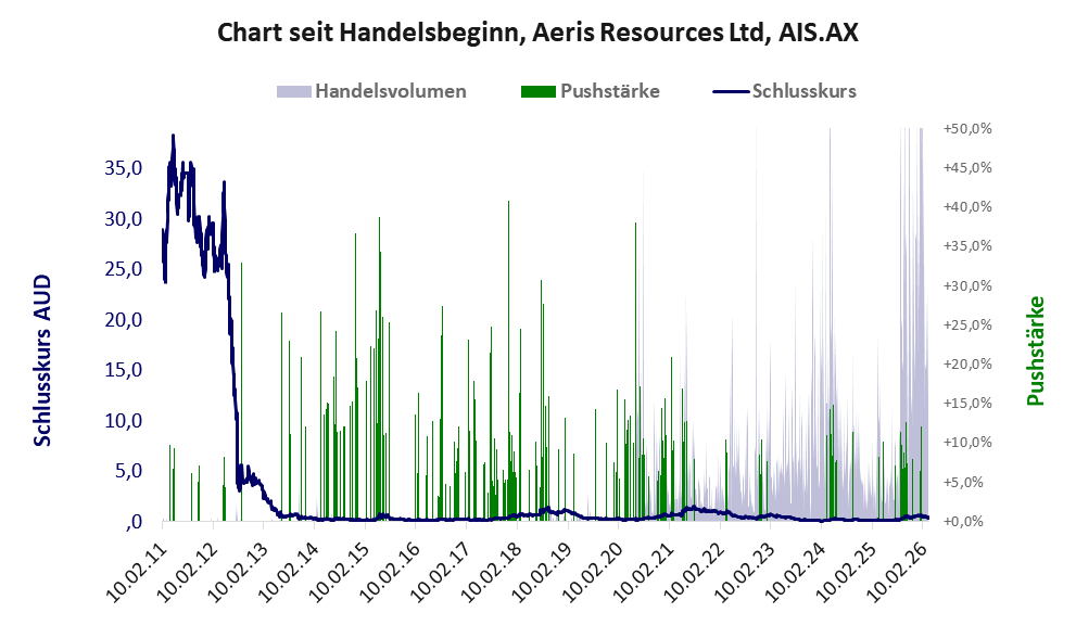 Bei dieser Aktie liegt das Inkassomodell vor. Das tägliche Handelsvolumen betrug an obiger Börse während der letzten drei Monate bis Berichtsdatum: 8.546.878 Stück, das sind 0,7% der ausgegebenen Aktien. Die hohe Geldverbrennung in der Explorationsphase von Aeris Resources hat sich gelohnt. Die Produktion wurde aufgenommen und man arbeitet profitabel.