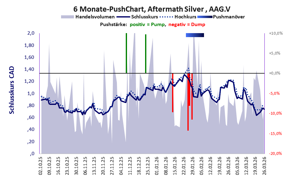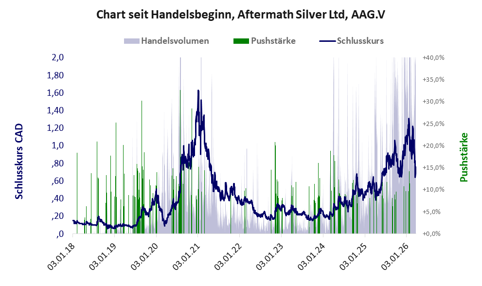 Bei dieser Aktie, über die w:o berichtet, liegt das Refreshmodell vor. Das tägliche Handelsvolumen betrug an obiger Börse während der letzten drei Monate bis Berichtsdatum: 1.447.160 Stück, das sind 0,4% der ausgegebenen Aktien. Bei Aftermath Silver fehlt ein operatives Geschäft, stattdessen wird das Geld der Investoren verbrannt.