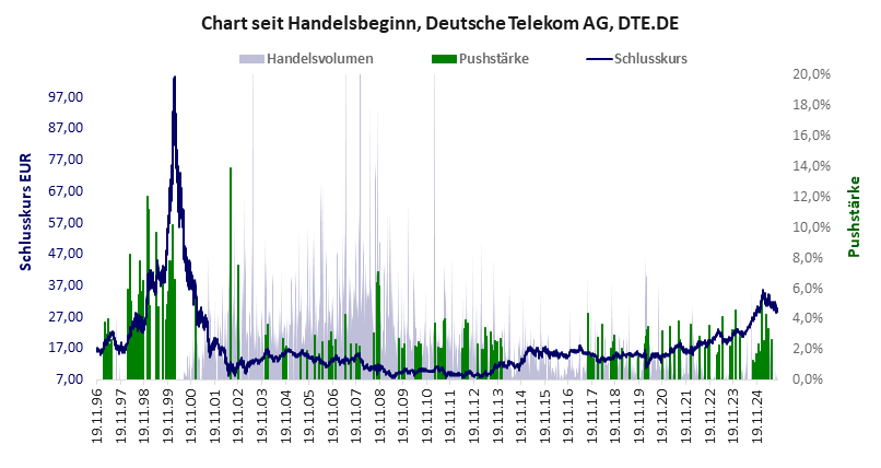 Auch erstklassige Aktien mit geringer Pushstärke haben Pushspitzen. Das kann man am Beispiel der Deutschen Telekom Aktie sehr gut verdeutlichen. Die Aktie hat eine Pushstärke von 3,5%. Als der Kurs ab 1997 stark anstieg, verzeichnete die Aktie Spitzenwerte von deutlich über 10%. Allerdings war der Kurs nicht durch Aktienpusher angetrieben worden, sondern durch das übertriebene Marketing der Deutschen Telekom.