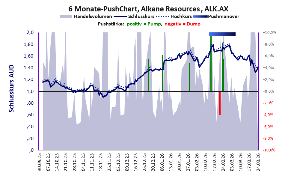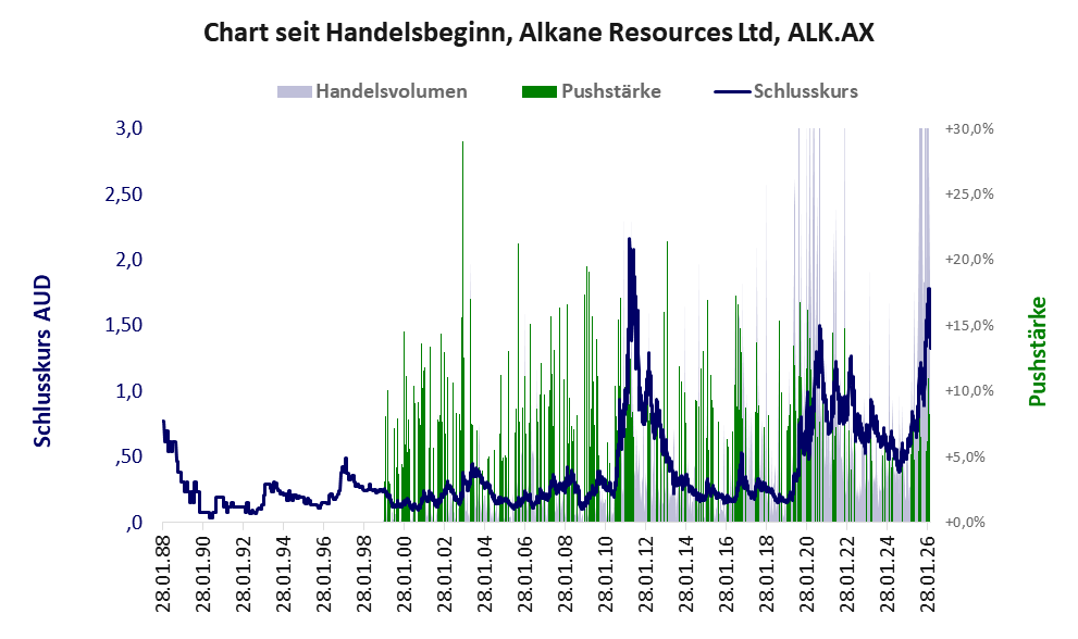 Über diese Aktie berichtet w:o. Das tägliche Handelsvolumen betrug an obiger Börse während der letzten drei Monate bis Berichtsdatum: 6.491.471 Stück, das sind 0,5% der ausgegebenen Aktien. Bei Alkane Resources liegt ein profitabler Geschäftsbetrieb vor.