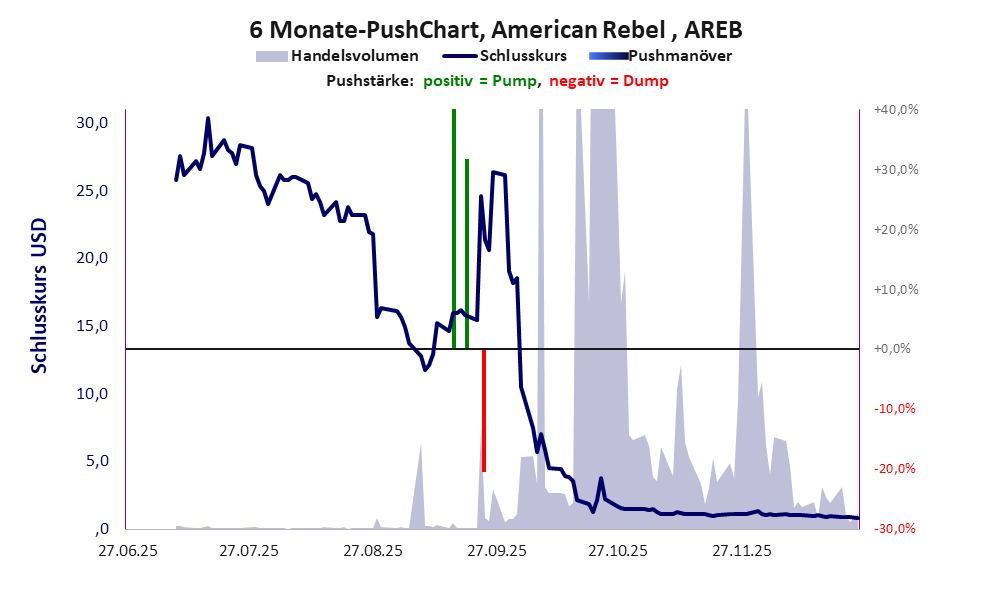 Bei dieser Aktie liegt das „Inkassomodell“ vor, bei dem der Aktienkurs zu Beginn der Geschichte sein Allzeithoch hat. Die Akteure verkaufen schon zu Beginn nach und nach ihre billigst erworbenen Aktien, so dass der Kurs in verhältnismäßig kurzer Zeit abstürzt. Danach dümpelt der Aktienkurs in den meistn Fällen nahe null dahin und die Aktie dient nur noch kleineren, dennoch gewinnbringenden Pushmanövern und in vielen Fällen dem Algotrading. Dem ersten Einbruch nachfolgende größere Pushmanöver sind aber nicht ausgeschlossen. Bei dieser Aktie vollzogen die Akteure mindestens einen Pump & Dump und leerten damit ganz gezielt die Taschen der Anleger. Obwohl das Vorgehen rechtswidrig ist, erfolgt kaum je eine Strafverfolgung.
