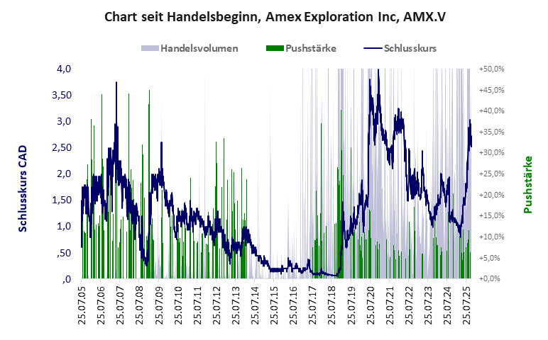 Amex Exploration hat ein schwaches Gesamtscoring und ist eine billige Aktie mit Kursgewinn. Das Gesamtvermögen ist groß, die Vermögenswerte scheinen nicht werthaltig zu sein, der Umsatz ist nicht existent, die Ertragslage extrem verlustreich, die Geldverbrennung gering.
