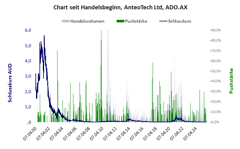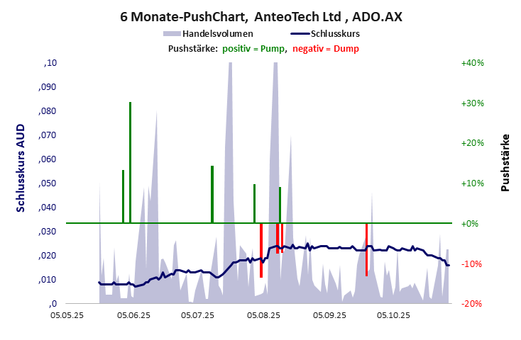 Die Firma hat nichts, der Kurs tut nichts, die Pushes bringen nichts, die Werbung taugt nichts. AnteoTech Ltd hat ein kritisches Gesamtscoring und ist ein mickriger Pennystock mit praktisch einem Totalverlust. Das Gesamtvermögen ist überschaubar, die Vermögenswerte scheinen werthaltig zu sein, der Umsatz ist überschaubar, die Ertragslage extrem verlustreich, die Geldverbrennung extrem hoch.