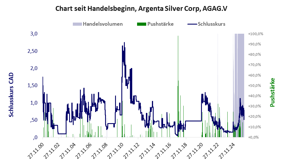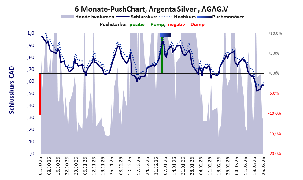 Bei dieser Aktie, über die w:o berichtet, gibt es 1 Pump & Dump-Manöver. Das tägliche Handelsvolumen betrug an obiger Börse während der letzten drei Monate bis Berichtsdatum: 1.664.083 Stück, das sind 0,6% der ausgegebenen Aktien. Da Argenta Silver kaum Vermögen besitzt und unprofitabel ist, hat der Aktienkurs keinen Wert. Die Aktie dient in erster Linie Pushmanövern.